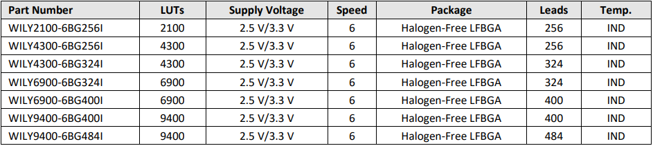 · 包含 4 种容量的器件,LUT4容量覆盖 2100 至 9400 个